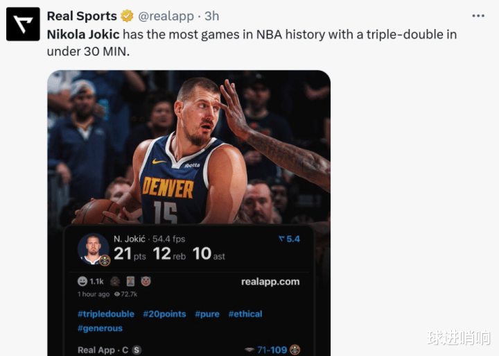 近两个赛季约基奇就拿到了38次三双,其中上赛季34次,本赛季4次,各项三双数据均为同期联盟第一,同时本场也是约基奇过去两个赛季第23次在前三节就拿到三双,同样位列联盟第一。