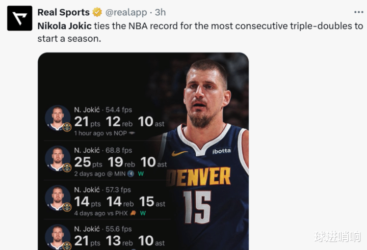本场对阵鹈鹕队,约基奇27分钟三节打卡拿到21+12+10三双数据,开季至今4场比赛完成三双4连击神奇表现。