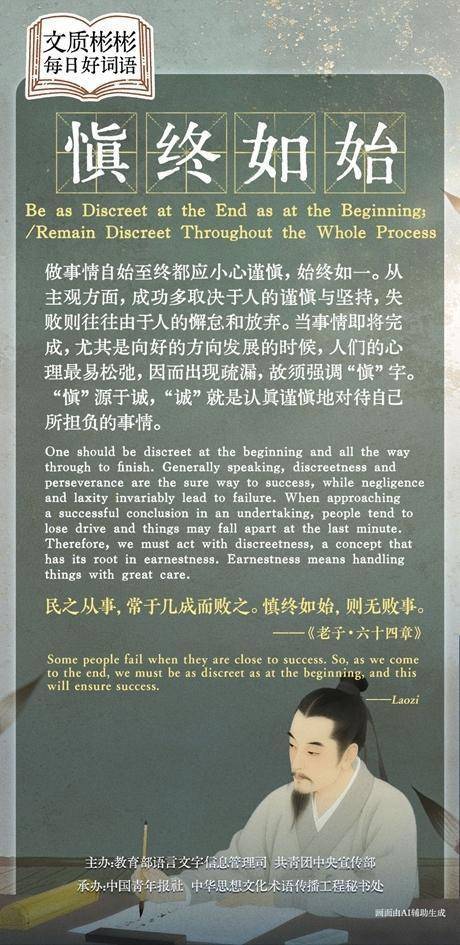 One should be discreet at the beginning and all the way through to finish. Generally speaking, discreetness and perseverance are the sure way to success, while negligence and laxity invariably lead to failure. When approaching a successful conclusion in an undertaking, people tend to lose drive and things may fall apart at the last minute. Therefore, we must act with discreetness, a concept that has its root in earnestness. Earnestness means handling things with great care.