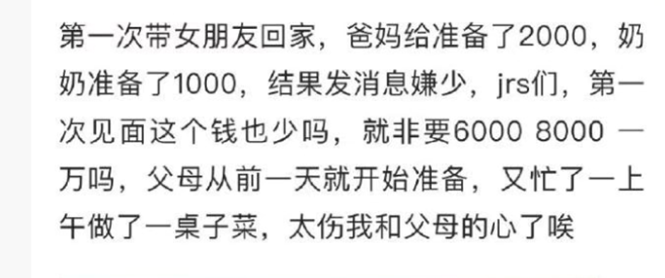 对于这些要求,男方当时并未拒绝,这表示,男方家里并非不大方,而是希望婚事循序渐进,该给到女方的都会给。