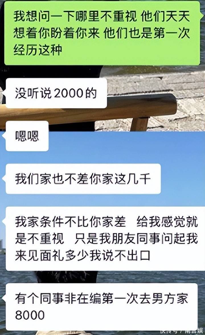 女方还用同事为例,她的同事非在编,去男方家里还给了8000元见面礼。言外之意,女方认为自己的条件比同事好,可为何见面礼只有这么少?!