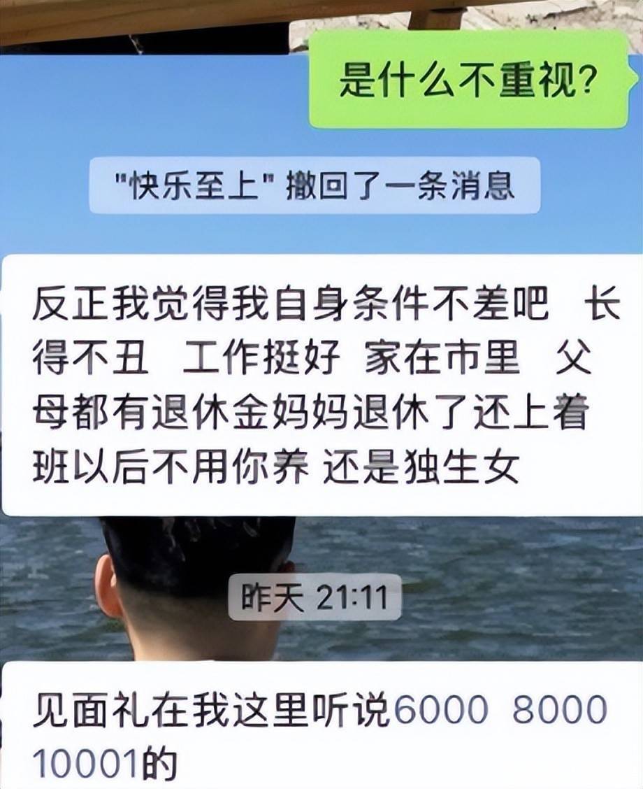 另外,女方还亮明了态度,在她这里,见面礼最少也要6000元,所以认为两人没有必要再继续下去了。